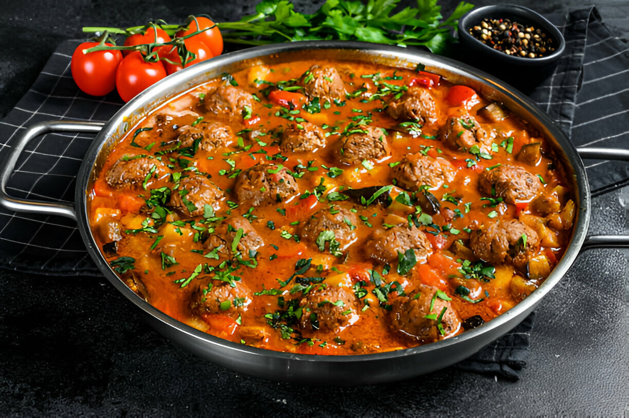 Bell peppers, white beans, meatballs, bacon, and broth are carefully layered to ensure every component absorbs the flavors of the sauce. A cornstarch slurry is whisked in to thicken the liquid just enough to create a luxurious, rich texture without overpowering the dish. Once everything is combined, the cassoulet is transferred to the oven, where slow baking allows the flavors to meld, resulting in a beautifully balanced, deeply comforting meal.