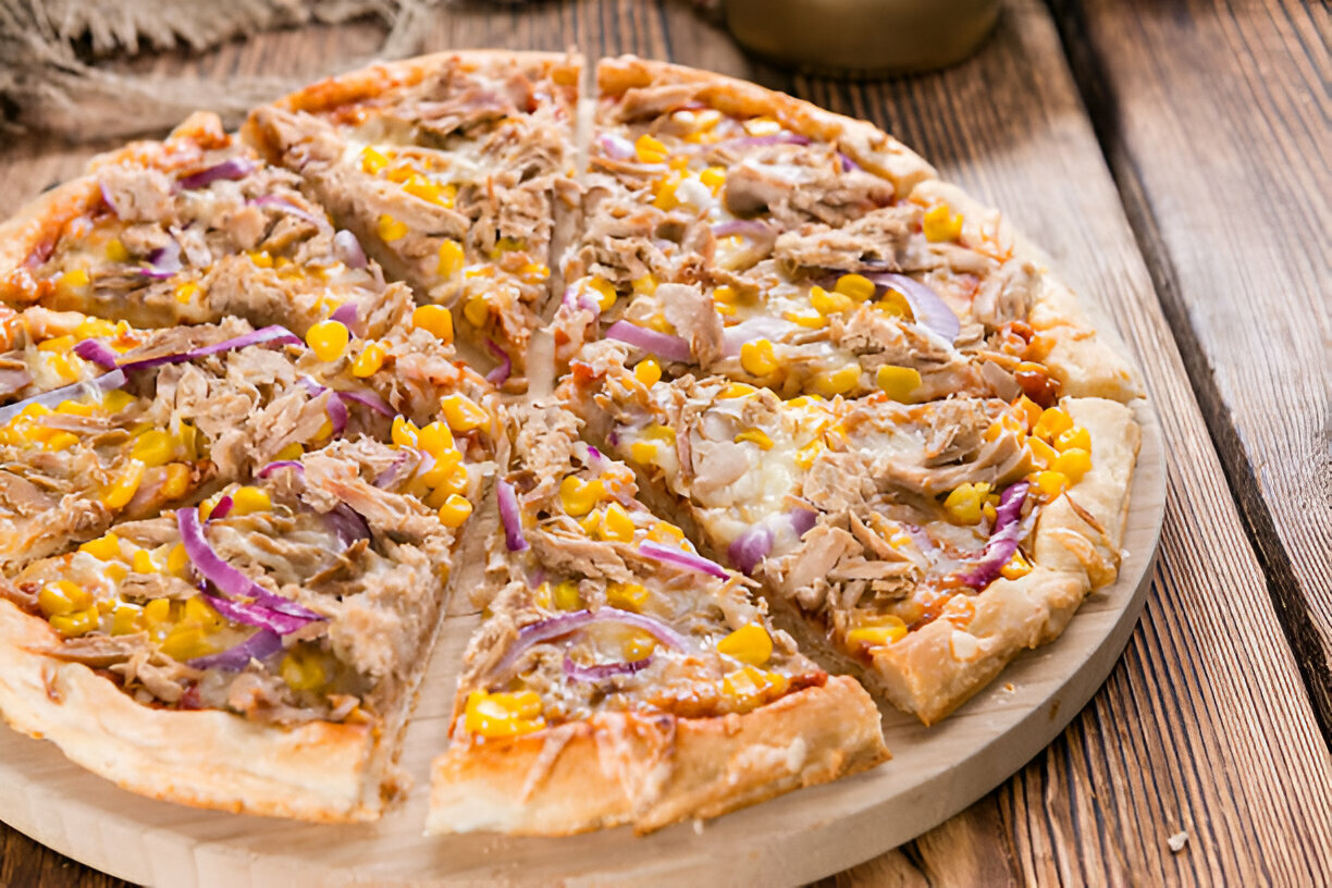 Canned tuna in brine is ideal for this recipeโlight, lean, and flaky. Drain it thoroughly and gently separate it with a fork to make spreading it over the pizza easier. Its saltiness contrasts nicely with the sweetcorn, creating a well-rounded bite.
